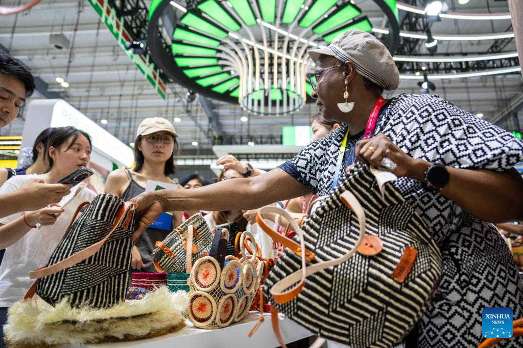 CHANGSHA, 13 junio, 2025 (Xinhua) -- Una expositora (d) presenta productos africanos a los visitantes durante la cuarta Exposición Económica y Comercial China-Africa en el Centro Internacional de Convenciones y Exposiciones de Changsha, en Changsha, en la provincia de Hunan, en el centro de China, el 13 de junio de 2025. La exposición levantó su cortina aquí el jueves, y permanece abierta al público en general del 13 al 15 de junio. (Xinhua/Chen Sihan)