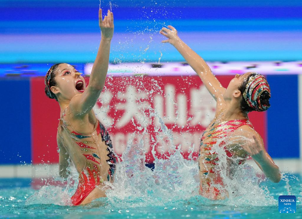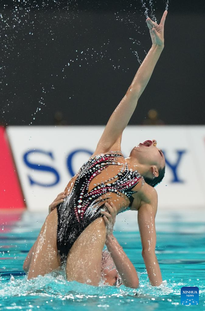 XI'AN, 14 junio, 2025 (Xinhua) -- Kobayashi Uta/Sato Tomoka, de Japón, compiten durante la final de dúo libre femenino en la Superfinal de la Copa del Mundo de Natación Artística 2025 de World Aquatics, en Xi'an, en la provincia de Shaanxi, en el noroeste de China, el 14 de junio de 2025. (Xinhua/Li Yibo)