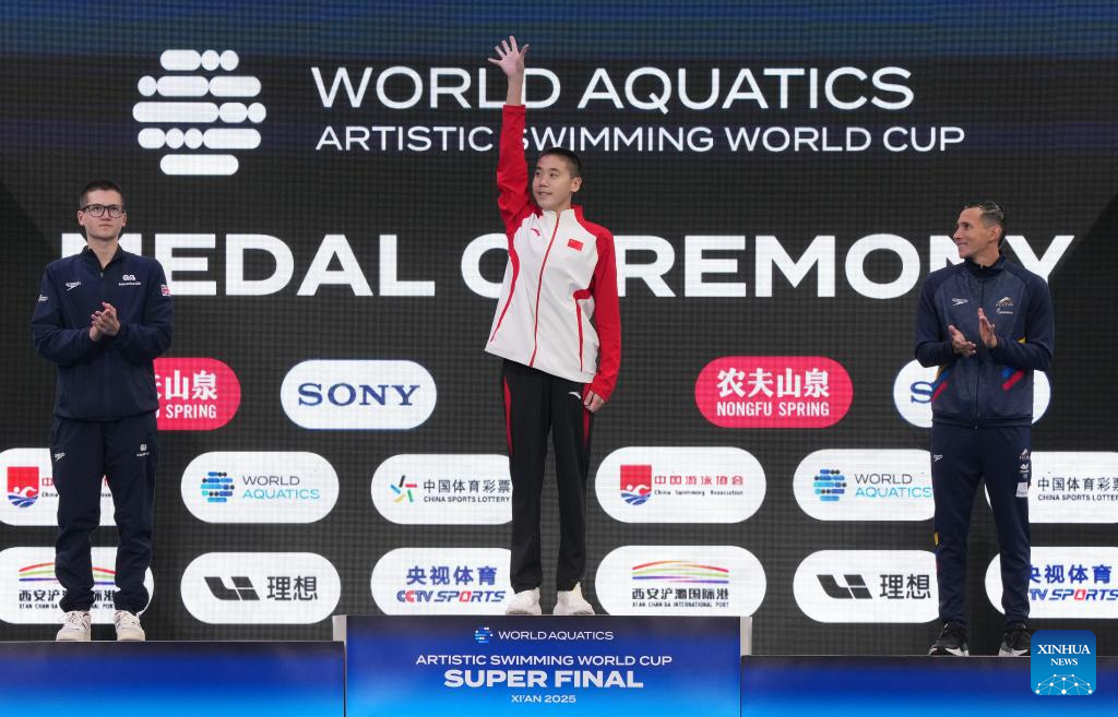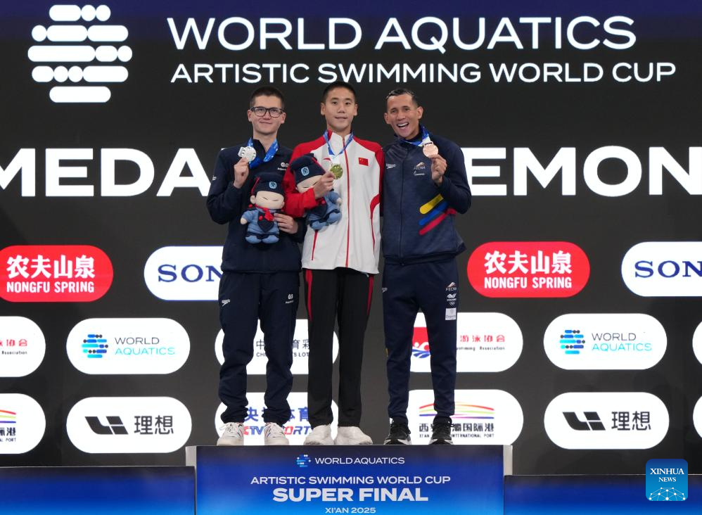 XI'AN, 14 junio, 2025 (Xinhua) -- El medallista de oro, Guo Muye (c), de China, el medallista de plata, Ranjuo Tomblin (i), de Reino Unido, y el medallista de bronce, Gustavo Adolfo Sánchez Acero, de Colombia, asisten a la ceremonia de premiación para el evento de solo libre masculino en la Superfinal de la Copa del Mundo de Natación Artística 2025 de World Aquatics, en Xi'an, en la provincia de Shaanxi, en el noroeste de China, el 14 de junio de 2025. (Xinhua/Li Yibo)