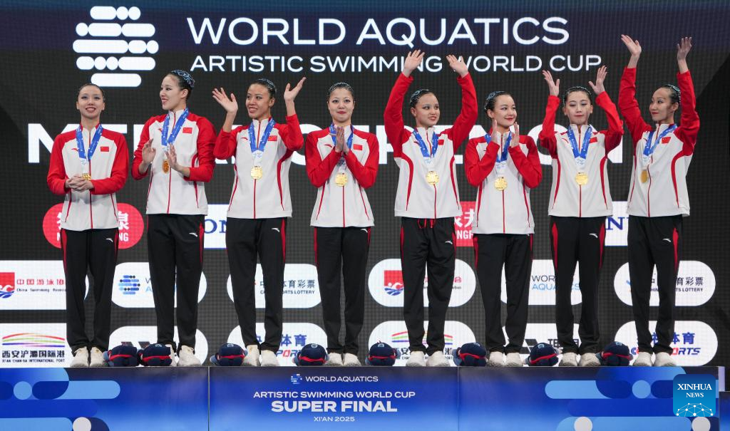 XI'AN, 14 junio, 2025 (Xinhua) -- Las medallistas de oro del Equipo de China saludan en el podio durante la ceremonia de premiación del evento de equipo libre en la Superfinal de la Copa del Mundo de Natación Artística 2025 de World Aquatics, en Xi'an, en la provincia de Shaanxi, en el noroeste de China, el 14 de junio de 2025. (Xinhua/Zou Jingyi)