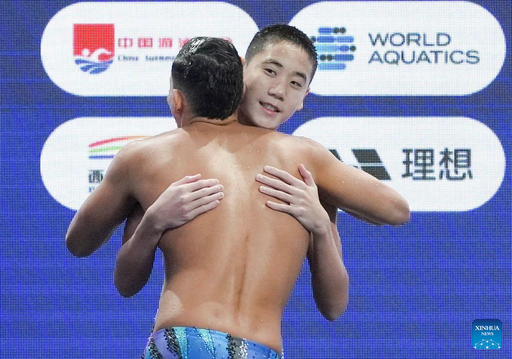 XI'AN, 14 junio, 2025 (Xinhua) -- Guo Muye (atrás), de China, y Gustavo Adolfo Sánchez Acero, de Colombia, se abrazan al término de la final de solo libre masculino en la Superfinal de la Copa del Mundo de Natación Artística 2025 de World Aquatics, en Xi'an, en la provincia de Shaanxi, en el noroeste de China, el 14 de junio de 2025. (Xinhua/Li Yibo)