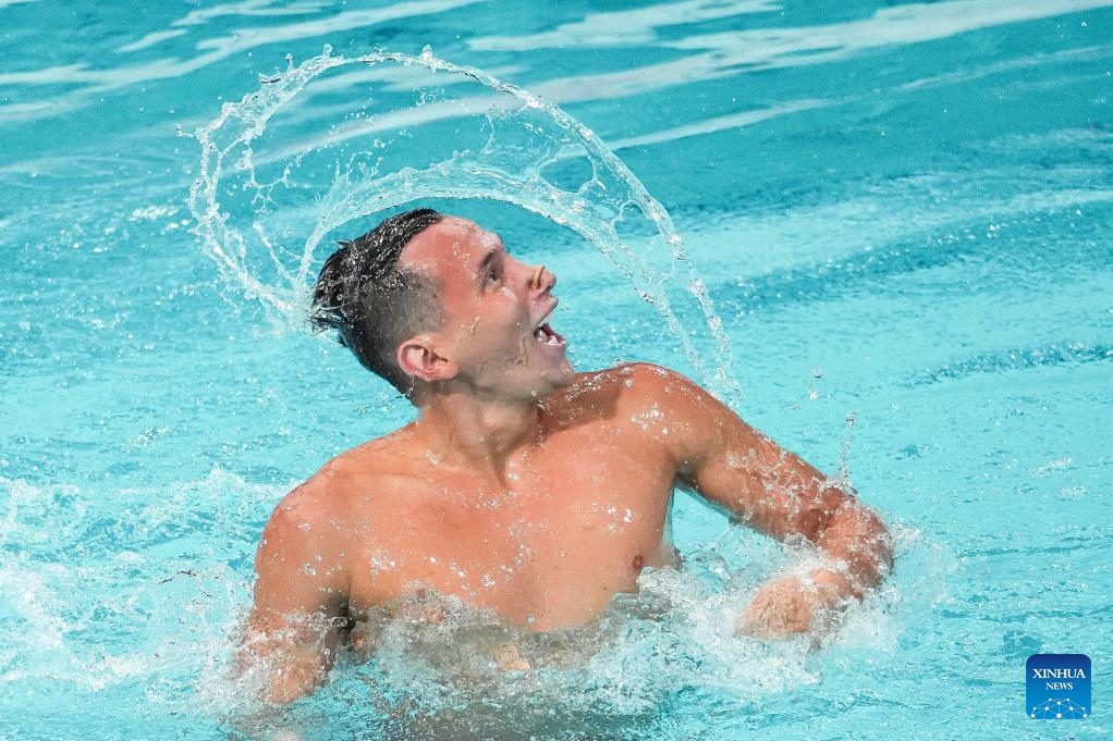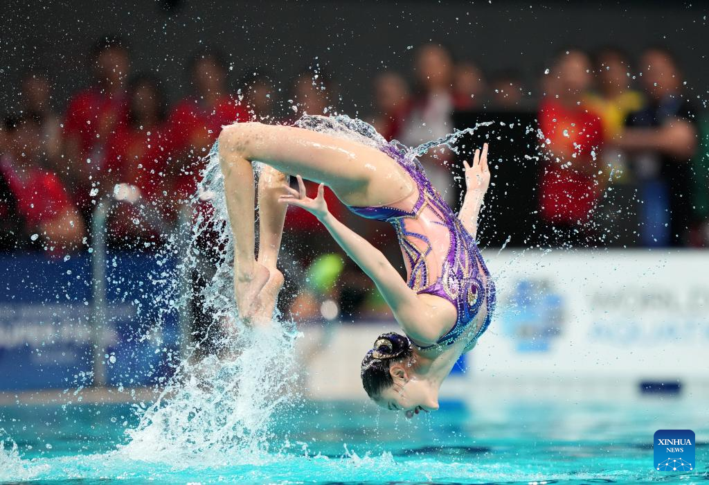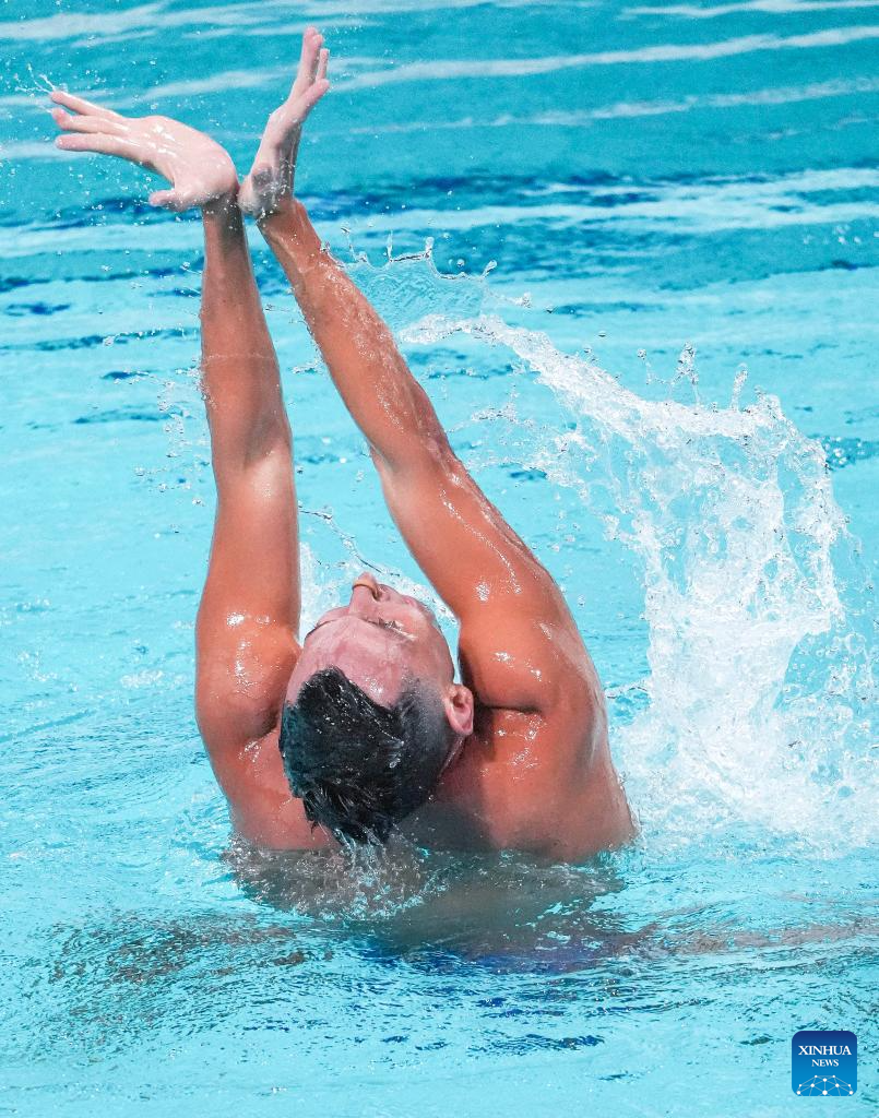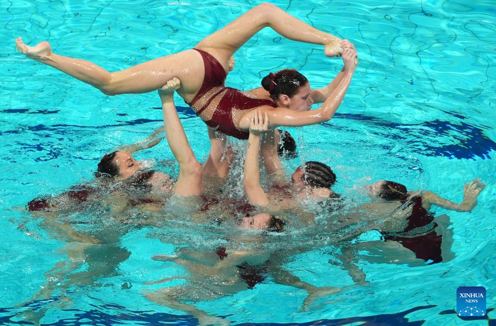 XI'AN, 14 junio, 2025 (Xinhua) -- El equipo de España compite durante el evento de equipo libre en la Superfinal de la Copa del Mundo de Natación Artística 2025 de World Aquatics, en Xi'an, en la provincia de Shaanxi, en el noroeste de China, el 14 de junio de 2025. (Xinhua/Li Yibo)