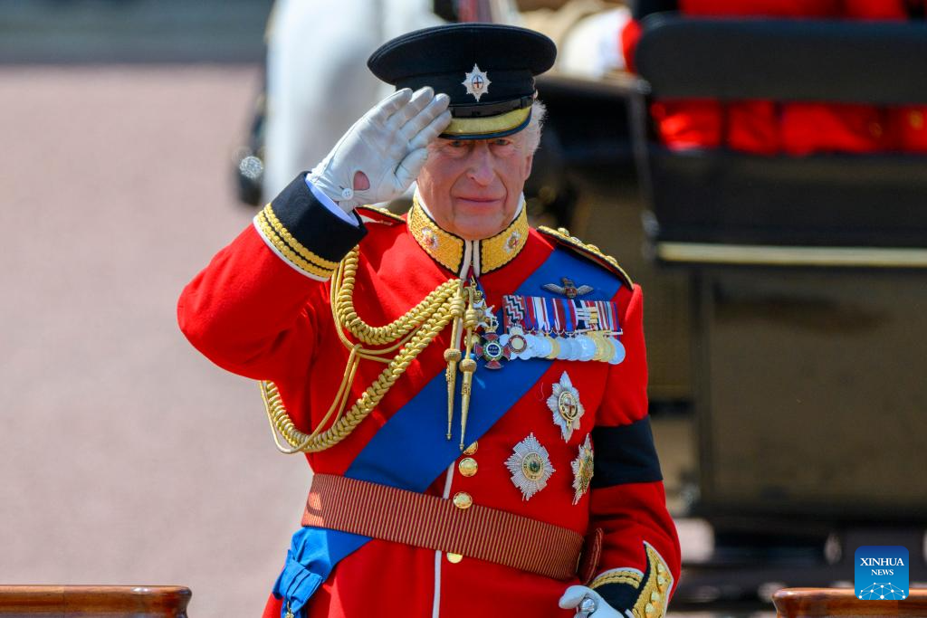 LONDRES, 15 junio, 2025 (Xinhua) -- Imagen del 14 de junio de 2025 del rey británico, Carlos III, asistiendo al desfile Trooping the Colour en su honor en su cumpleaños oficial, en Londres, Reino Unido. (Xinhua/Ray Tang)