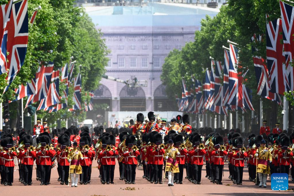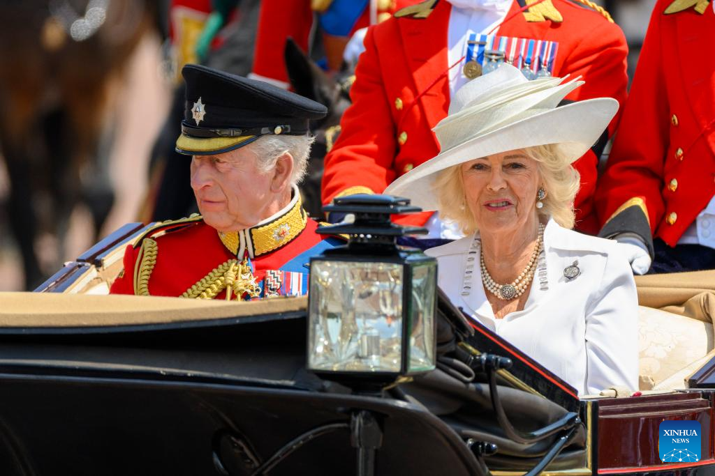 LONDRES, 15 junio, 2025 (Xinhua) -- Imagen del 14 de junio de 2025 del rey británico, Carlos III, y la reina Camila, asistiendo al desfile Trooping the Colour, en honor al rey británico Carlos III en su cumpleaños oficial, en Londres, Reino Unido. (Xinhua/Ray Tang)