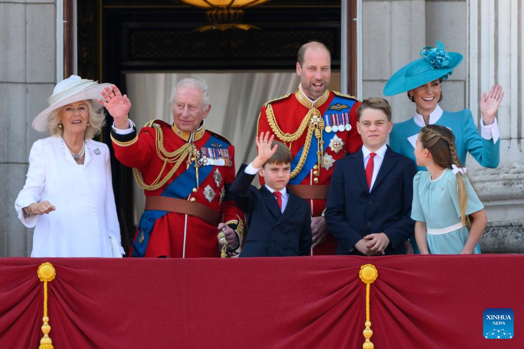 LONDRES, 15 junio, 2025 (Xinhua) -- Imagen del 14 de junio de 2025 de miembros de la Familia Real saludando a la multitud en el balcón del Palacio de Buckingham durante el desfile Trooping the Colour, en honor al rey británico Carlos III en su cumpleaños oficial, en Londres, Reino Unido. (Xinhua/Ray Tang)