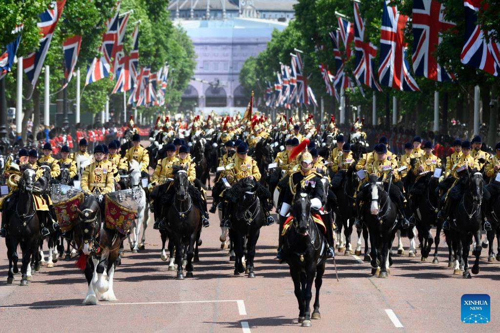 LONDRES, 15 junio, 2025 (Xinhua) -- Imagen del 14 de junio de 2025 de miembros de la División de la Casa Real desfilando durante el desfile Trooping the Colour, en honor al rey británico Carlos III en su cumpleaños oficial, en Londres, Reino Unido. (Xinhua/Ray Tang)