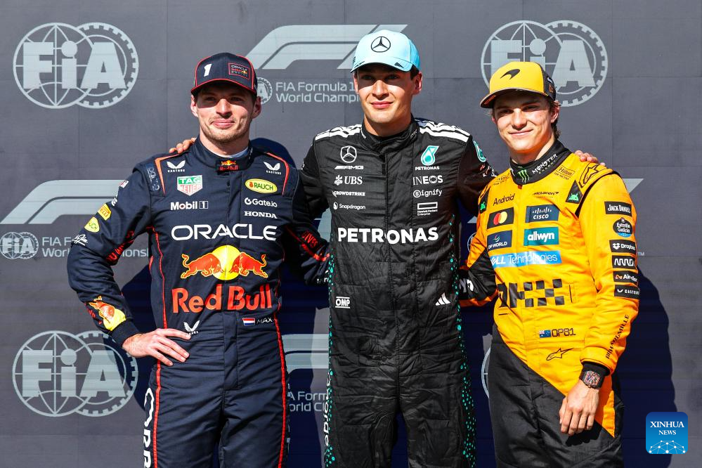 MONTREAL, 15 junio, 2025 (Xinhua) -- Imagen del 14 de junio de 2025 del ganador de la pole position, el piloto británico de la escudería Mercedes, George Russell (c), el ganador del segundo lugar, el piloto neerlandés de la escudería Red Bull, Max Verstappen (i), y el ganador del tercer lugar, el piloto australiano de la escudería McLaren, Oscar Piastri, posando después de la sesión de clasificación del Gran Premio de Canadá de Fórmula Uno 2025, en el Circuito Gilles Villeneuve, en Montreal, Canadá. (Xinhua/Song Haiyuan)