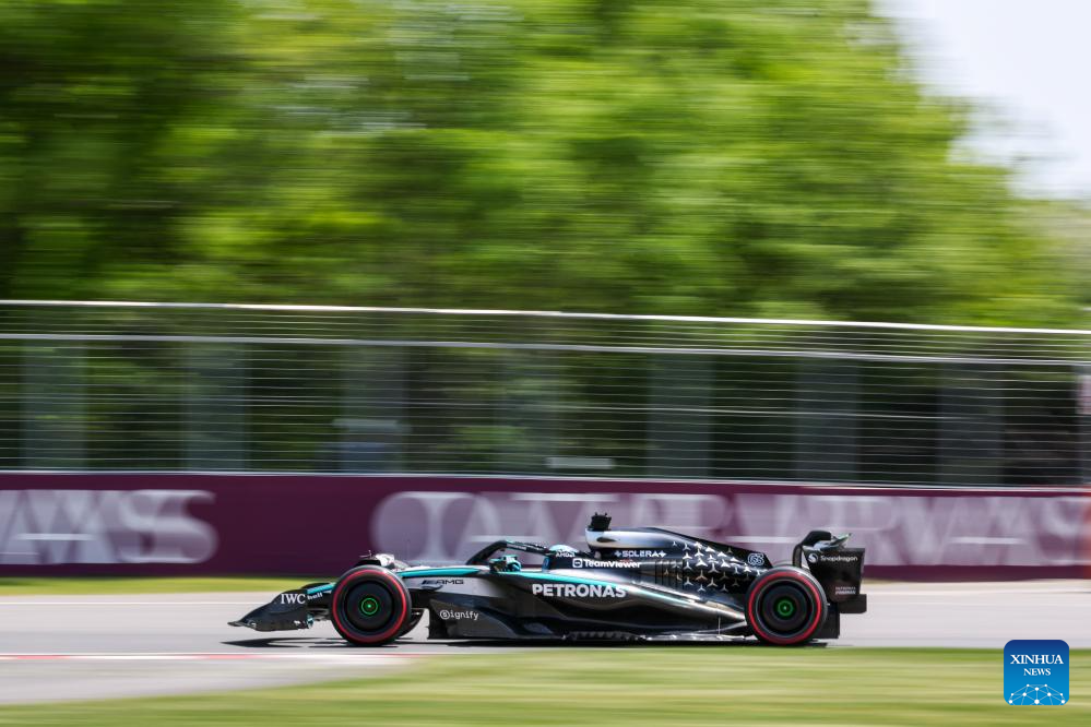 MONTREAL, 15 junio, 2025 (Xinhua) -- Imagen del 14 de junio de 2025 del piloto británico de la escudería Mercedes, George Russell, compitiendo durante la sesión de clasificación del Gran Premio de Canadá de Fórmula Uno 2025, en el Circuito Gilles Villeneuve, en Montreal, Canadá. (Xinhua/Song Haiyuan)