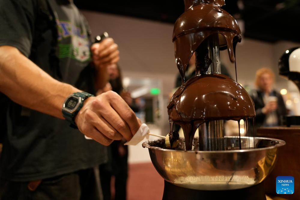 MONTEVIDEO, 15 junio, 2025 (Xinhua) -- Imagen del 13 de junio de 2025 de un visitante cubriendo frutas con chocolate durante la Feria Internacional del Alfajor, en Montevideo, Uruguay. La Feria Internacional del Alfajor comenzó el viernes en el Laboratorio Tecnológico de Uruguay, en la capital Montevideo, y durará hasta el 15 de junio. (Xinhua/Nicolás Celaya)
