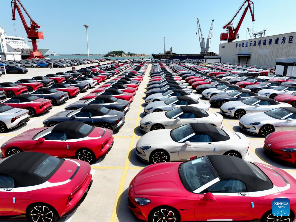 BEIJING, 16 junio, 2025 (Xinhua) -- Imagen tomada con un dron el 16 de junio de 2025 de vehículos que serán transportados en el Puerto de Lianyungang, en la provincia de Jiangsu, en el este de China. La economía de China continuó expandiéndose de manera sostenida en mayo, respaldada por las medidas políticas en curso que ayudaron a sostener la recuperación en medio de las incertidumbres globales, mostraron datos oficiales el lunes. (Xinhua/Wang Chun)