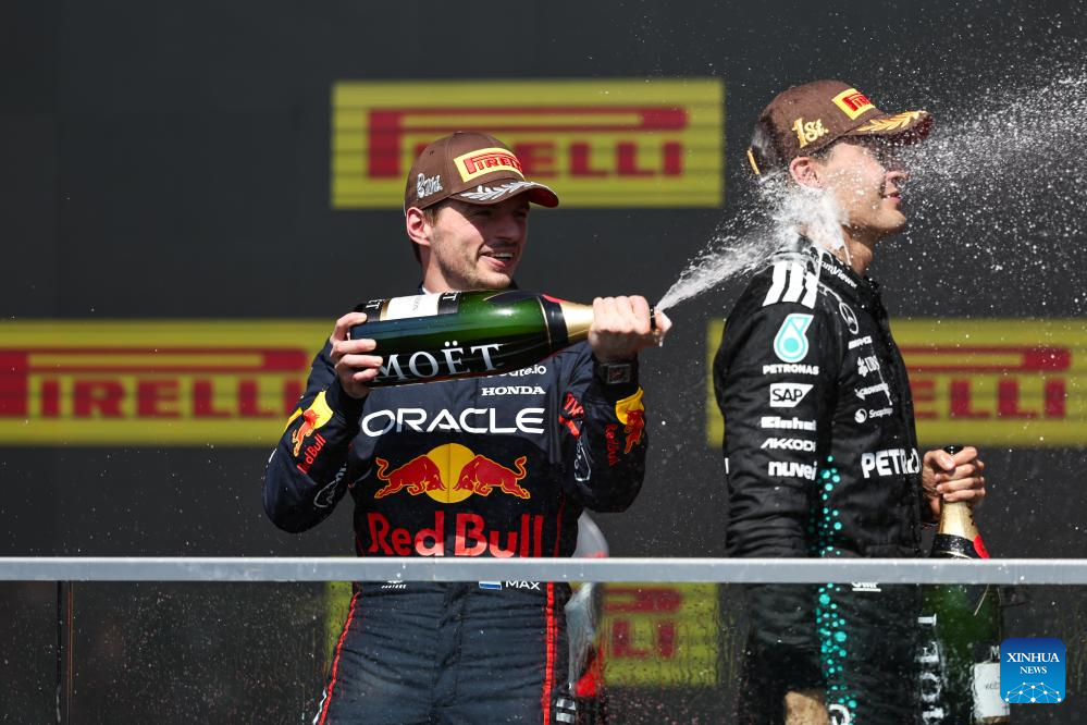 MONTREAL, 16 junio, 2025 (Xinhua) -- Imagen del 15 de junio de 2025 del ganador del primer lugar, el piloto británico de la escudería Mercedes, George Russell (d), y el ganador del segundo lugar, el piloto neerlandés de la escudería Red Bull, Max Verstappen, festejando durante la ceremonia de premiación después de la carrera del Gran Premio de Canadá de Fórmula Uno 2025, en el Circuito Gilles Villeneuve, en Montreal, Canadá. (Xinhua/Song Haiyuan)