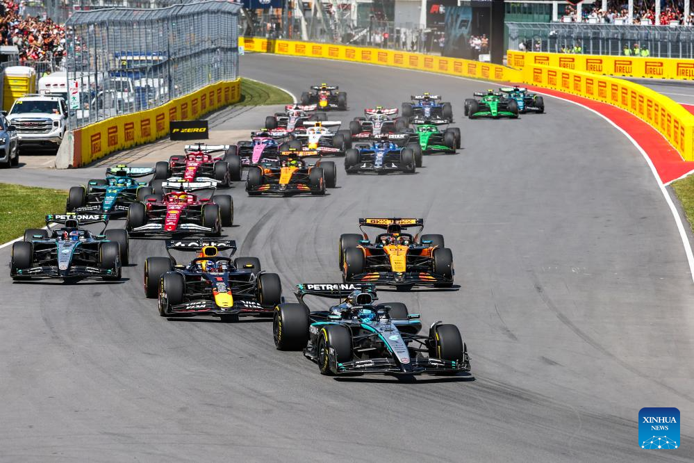 MONTREAL, 16 junio, 2025 (Xinhua) -- Imagen del 15 de junio de 2025 de pilotos compitiendo durante la carrera del Gran Premio de Canadá de Fórmula Uno 2025, en el Circuito Gilles Villeneuve, en Montreal, Canadá. (Xinhua/Song Haiyuan)
