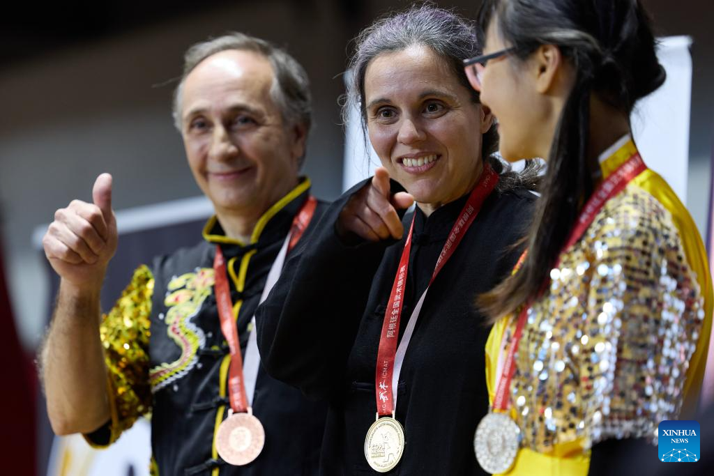 BUENOS AIRES, 16 junio, 2025 (Xinhua) -- Imagen del 15 de junio de 2025 de atletas recibiendo medallas durante el Campeonato Nacional de Wushu de Argentina, en Buenos Aires, Argentina. (Xinhua/Meng Dingbo)