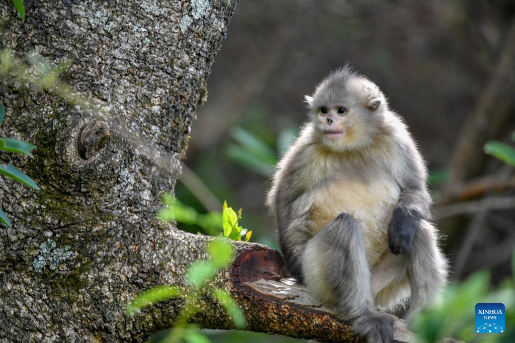 DEQEN, 17 junio, 2025 (Xinhua) -- Imagen del 15 de junio de 2025 un mono de nariz chata blanco y negro en la Reserva Natural Nacional de la Montaña Nevada de Baima, en la prefectura autónoma tibetana de Deqen, en la provincia de Yunnan, en el suroeste de China. El mono de nariz chata blanco y negro, también conocido como mono de pelo dorado de Yunnan, es un animal protegido nacional de primera clase en China. (Xinhua/Peng Yikai)