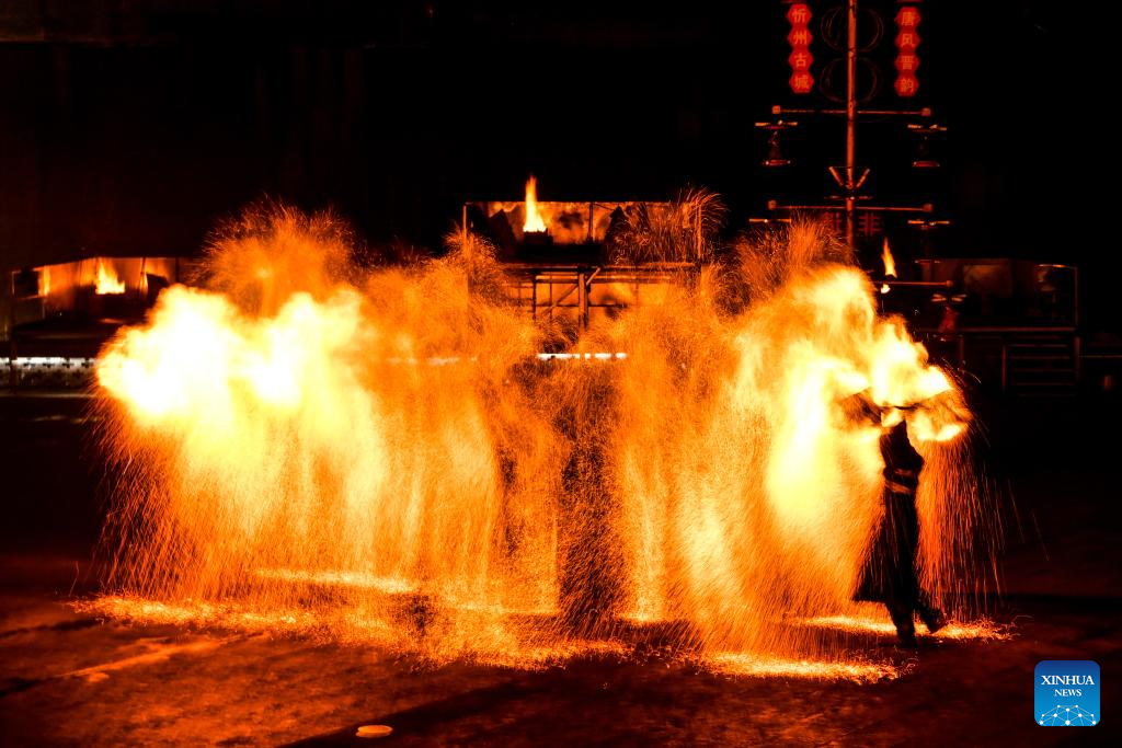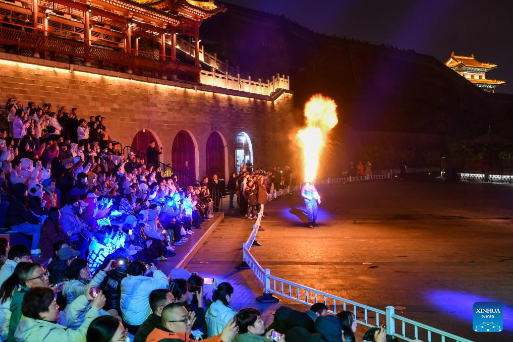 XINZHOU, 26 octubre, 2025 (Xinhua) -- Imagen del 23 de octubre de 2025 de una presentación de Huohu (olla de fuego), en la antigua ciudad de Xinzhou, en la provincia de Shanxi, en el norte de China. El turismo de ocio en la antigua ciudad de Xinzhou sigue en auge a finales de otoño. Las actividades turísticas, como bañarse en aguas termales, tomarse fotografías con trajes antiguos y observan presentaciones del patrimonio cultural inmaterial, han atraído a muchos turistas a visitar la antigua ciudad durante unos días, para sumergirse profundamente en el encanto único de la cultura tradicional. (Xinhua/Cao Yang)