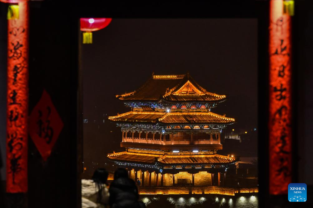 XINZHOU, 26 octubre, 2025 (Xinhua) -- Imagen del 22 de octubre de 2025 de una vista nocturna de la antigua ciudad de Xinzhou, en la provincia de Shanxi, en el norte de China. El turismo de ocio en la antigua ciudad de Xinzhou sigue en auge a finales de otoño. Las actividades turísticas, como bañarse en aguas termales, tomarse fotografías con trajes antiguos y observan presentaciones del patrimonio cultural inmaterial, han atraído a muchos turistas a visitar la antigua ciudad durante unos días, para sumergirse profundamente en el encanto único de la cultura tradicional. (Xinhua/Cao Yang)