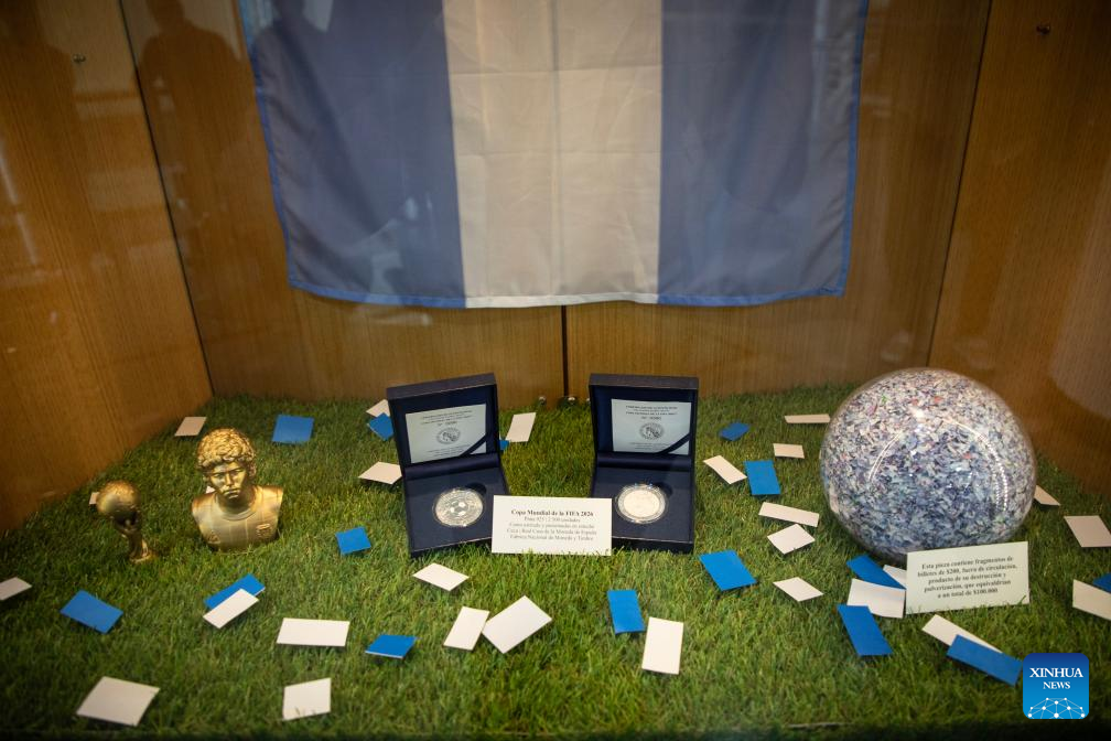 Las dos caras de la moneda conmemorativa de plata Copa Mundial FIFA 2026 son exhibidas en el estand de ediciones numismáticas del Banco Central de la República Argentina (BCRA), en la ciudad de Buenos Aires, capital de Argentina, el 29 de octubre de 2025. El BCRA lanzó el martes una moneda que conmemora el histórico gol de Diego Armando Maradona ante Inglaterra en el Mundial de México 1986. (Xinhua/Martín Zabala)