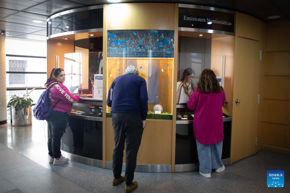 Personas adquieren la moneda conmemorativa de plata Copa Mundial FIFA 2026 en el estand de ediciones numismáticas del Banco Central de la República Argentina (BCRA), en la ciudad de Buenos Aires, capital de Argentina, el 29 de octubre de 2025. El BCRA lanzó el martes una moneda que conmemora el histórico gol de Diego Armando Maradona ante Inglaterra en el Mundial de México 1986. (Xinhua/Martín Zabala)