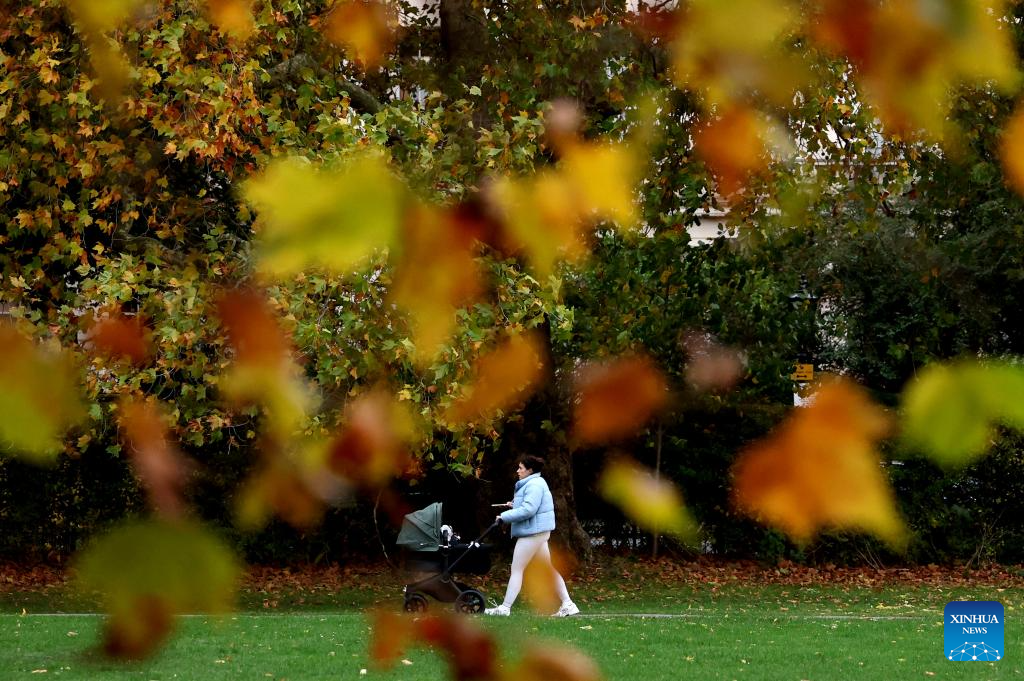 LONDRES, 28 octubre, 2025 (Xinhua) -- Imagen del 27 de octubre de 2025 de una mujer empujando una carriola para bebé en el Regent's Park, en Londres, Reino Unido. (Xinhua/Li Ying)