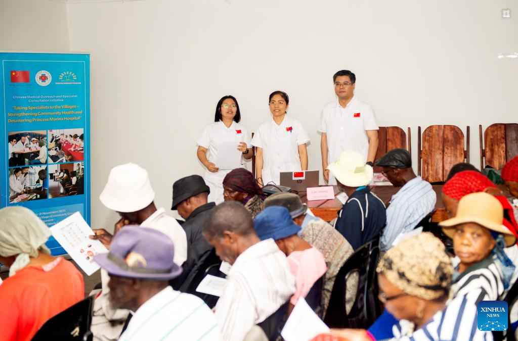 GABORONE, 2 noviembre, 2025 (Xinhua) -- Imagen del 1 de noviembre de 2025 de miembros del 17 grupo del equipo médico chino en Botsuana (atrás) vistos durante un programa conjunto de atención médica y consultas con especialistas para residentes mayores en la aldea de Mokolodi, a unos 18 kilómetros al suroeste de Gaborone, Botsuana. El ministro de Justicia y Servicios Penitenciarios de Botsuana, Nelson Ramaotwana, elogió el sábado al 17 grupo del equipo médico chino en Botsuana y a la Asociación Benéfica China en Botsuana por sus esfuerzos y apoyo para fortalecer la salud comunitaria. (Xinhua/Tshekiso Tebalo)