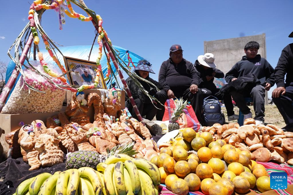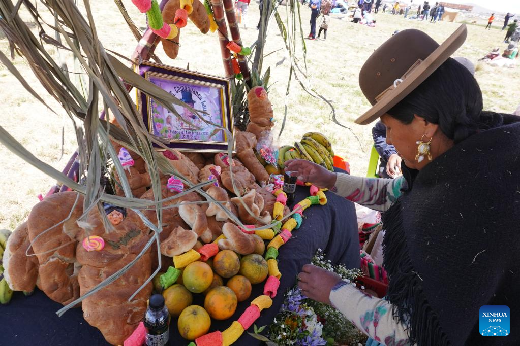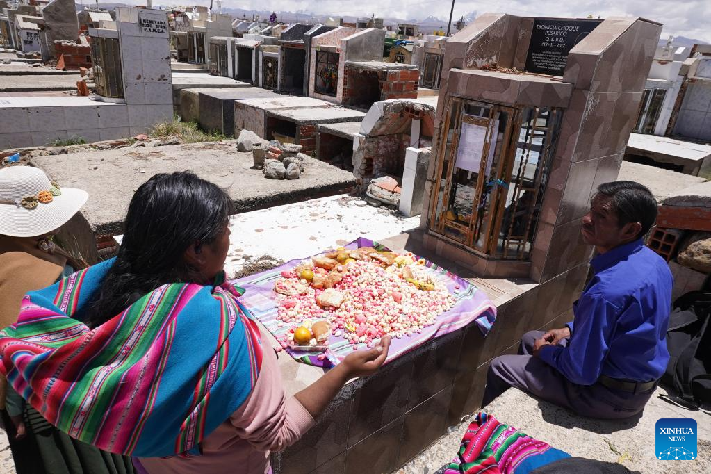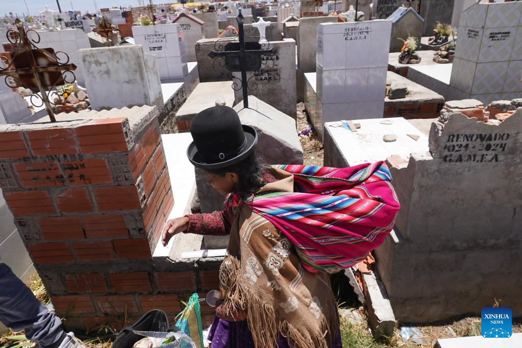 EL ALTO, 2 noviembre, 2025 (Xinhua) -- Una mujer indígena coloca una ofrenda en la tumba de su familiar en el marco de las celebraciones de Todos Santos, en la ciudad de El Alto, Bolivia, el 2 de noviembre de 2025. (Xinhua/Javier Mamani)