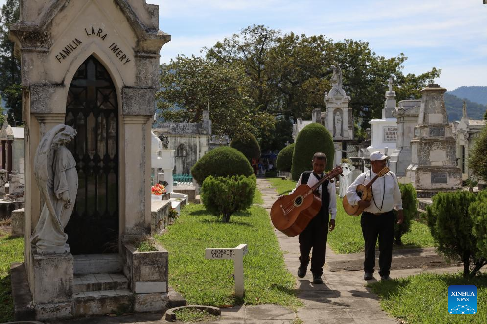 SAN SALVADOR, 2 noviembre, 2025 (Xinhua) -- Músicos cargan instrumentos mientras caminan entre las tumbas durante la conmemoración del Día de los Difuntos en el Cementerio de Los Ilustres, en el departamento de San Salvador, capital de El Salvador, el 2 de noviembre de 2025. (Xinhua/Alexander Peña)