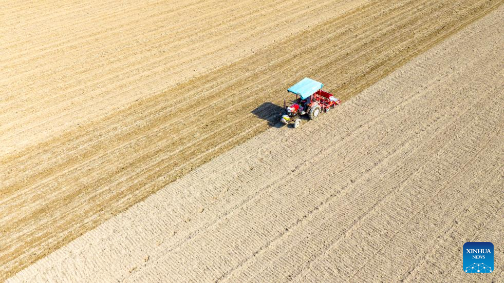 BEIJING, 3 noviembre, 2025 (Xinhua) -- Vista aérea tomada con un dron de un agricultor sembrando trigo en un campo, en la ciudad de Linyi, en la provincia de Shandong, en el este de China, el 3 de noviembre de 2025. Para el 30 de octubre, se ha cosechado más del 90 por ciento de los cereales de otoño y se ha sembrado más del 25 por ciento del trigo de invierno en todo el país. (Xinhua/Zhang Chunlei)