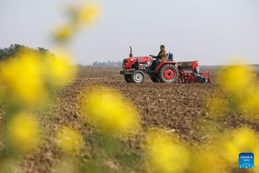 BEIJING, 3 noviembre, 2025 (Xinhua) -- Un agricultor siembra trigo en un campo, en la ciudad de Pingdingshan, en la provincia de Henan, en el centro de China, el 3 de noviembre de 2025. Para el 30 de octubre, se ha cosechado más del 90 por ciento de los cereales de otoño y se ha sembrado más del 25 por ciento del trigo de invierno en todo el país. (Xinhua/He Wuchang)
