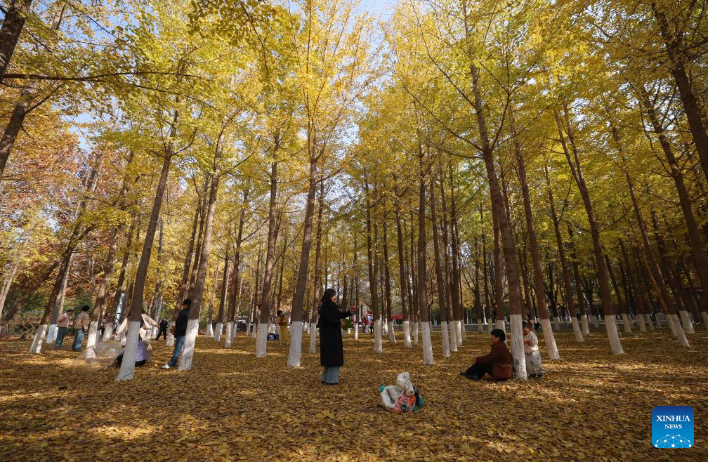 TIANJIN, 4 noviembre, 2025 (Xinhua) -- Personas disfrutan de la vista de un bosque de ginkgos en un parque forestal, en Tianjin, en el norte de China, el 4 de noviembre de 2025. (Xinhua/Sun Fanyue)