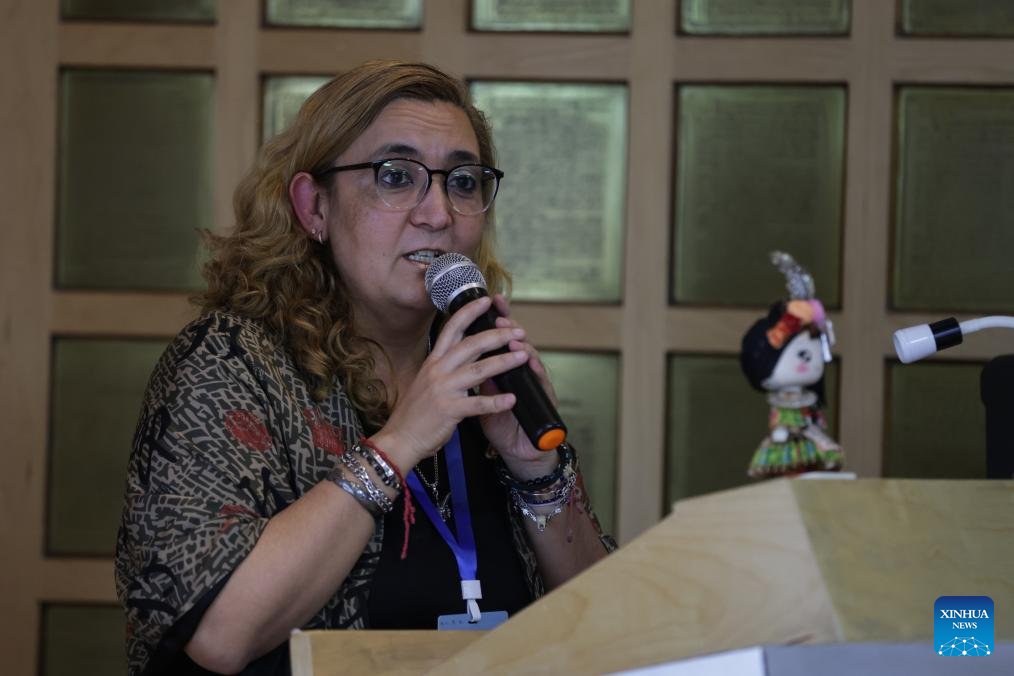 Imagen del 4 de noviembre de 2025 de la directora del Museo Casa de Carranza, Karla Peniche, hablando durante el Intercambio Cultural y Cinematográfico "Guizhou Multicolor", en el Museo Casa de Carranza, en la Ciudad de México, capital de México. El Museo Casa de Carranza de la capital mexicana acogió el martes el Intercambio Cultural y Cinematográfico "Guizhou Multicolor", en el que se proyectaron documentales que mostraron la riqueza natural, cultural y social de una de las provincias más diversas de China. (Xinhua/Francisco Cañedo)