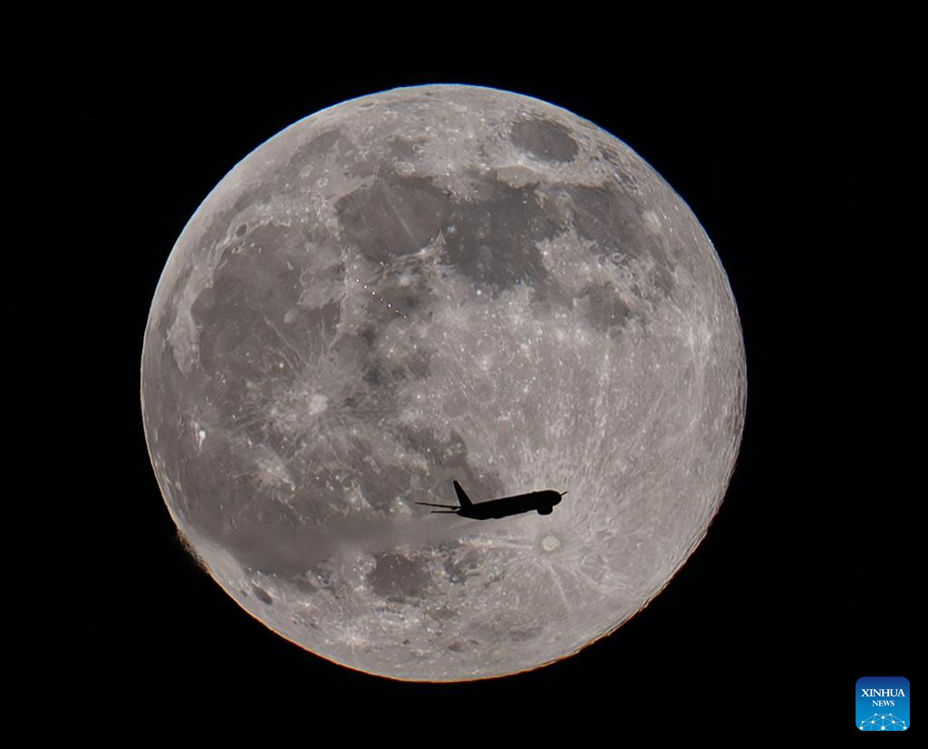 CIUDAD DE KUWAIT, 5 noviembre, 2025 (Xinhua) -- La luna llena es vista con un avión sobrevolando la Ciudad de Kuwait, Kuwait, el 5 de noviembre de 2025. (Xinhua/Asad)