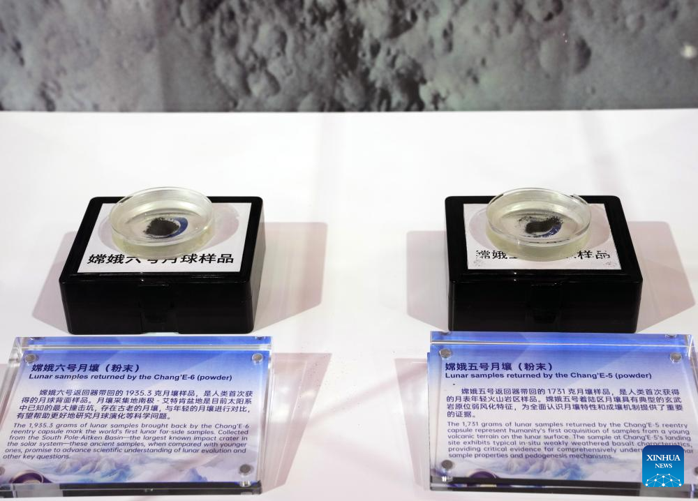 SHANGHAI, 5 noviembre, 2025 (Xinhua) -- Muestras lunares recuperadas en las misiones Chang'e-5 y Chang'e-6 son exhibidas en el Pabellón de China durante la VIII Exposición Internacional de Importaciones de China (CIIE, por sus siglas en inglés), en Shanghai, en el este de China, el 5 de noviembre de 2025. La VIII CIIE se inauguró el miércoles en Shanghai. Entre los aspectos más destacados del Pabellón de China se incluyen los últimos logros de China en la profundización integral de la reforma y la apertura de alto nivel durante el período del XIV Plan Quinquenal (2021-2025). (Xinhua/Liu Ying)