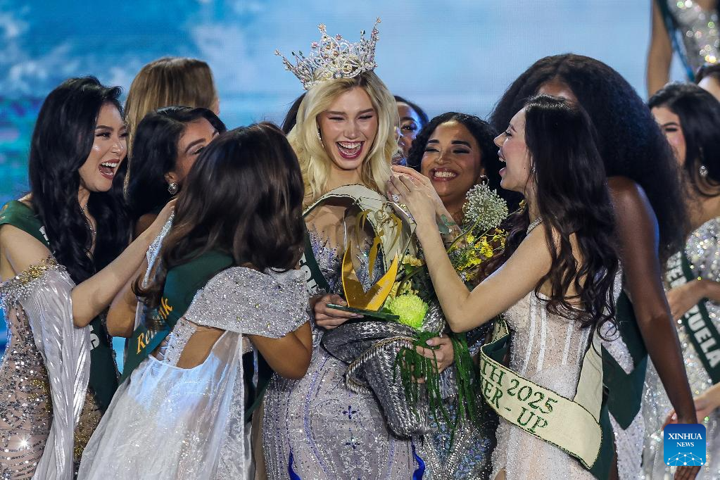 CIUDAD DE PARAÑAQUE, 5 noviembre, 2025 (Xinhua) -- La recién coronada Miss Tierra 2025, Natalie Puskinova (c), de República Checa, es felicitada por las otras candidatas durante la noche de coronación de Miss Tierra 2025, en la ciudad de Parañaque, Filipinas, el 5 de noviembre de 2025. (Xinhua/Rouelle Umali)
