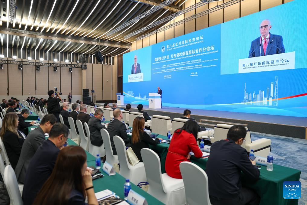 SHANGHAI, 6 noviembre, 2025 (Xinhua) -- Un subforo titulado "Cooperación Internacional en la Protección de los Derechos de Propiedad Intelectual (DPI) y la Lucha Contra la Infracción y la Falsificación de los DPI" es celebrado durante VIII Foro Económico Internacional de Hongqiao en el Centro Nacional de Exposiciones y Convenciones (Shanghai), en Shanghai, en el este de China, el 6 de noviembre de 2025. (Xinhua/Wang Zecong)