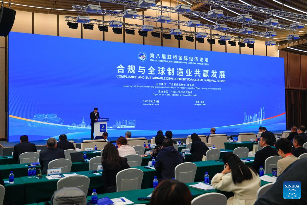 SHANGHAI, 6 noviembre, 2025 (Xinhua) -- Un subforo titulado "Cumplimiento y Desarrollo Sostenible para la Manufactura Global" es celebrado durante VIII Foro Económico Internacional de Hongqiao en el Centro Nacional de Exposiciones y Convenciones (Shanghai), en Shanghai, en el este de China, el 6 de noviembre de 2025. (Xinhua/Liu Jiaqi)