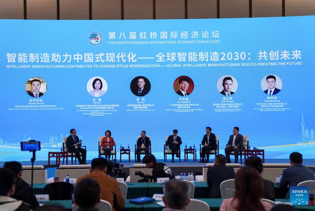 SHANGHAI, 6 noviembre, 2025 (Xinhua) -- Un subforo titulado "La Manufactura Inteligente Contribuye a la Modernización al Estilo Chino -- Manufactura Inteligente global 2030: Co-creando el Futuro" es celebrado durante VIII Foro Económico Internacional de Hongqiao en el Centro Nacional de Exposiciones y Convenciones (Shanghai), en Shanghai, en el este de China, el 6 de noviembre de 2025. (Xinhua/Fan Yuqing)