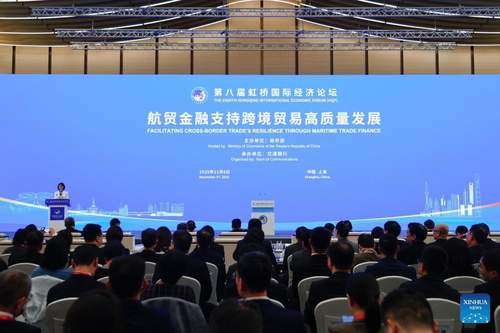 SHANGHAI, 6 noviembre, 2025 (Xinhua) -- Un subforo titulado "Facilitar la Resiliencia del Comercio Transfronterizo A Través de la Financiación del Comercio Marítimo" es celebrado durante VIII Foro Económico Internacional de Hongqiao en el Centro Nacional de Exposiciones y Convenciones (Shanghai), en Shanghai, en el este de China, el 6 de noviembre de 2025. (Xinhua/Liu Jiaqi)