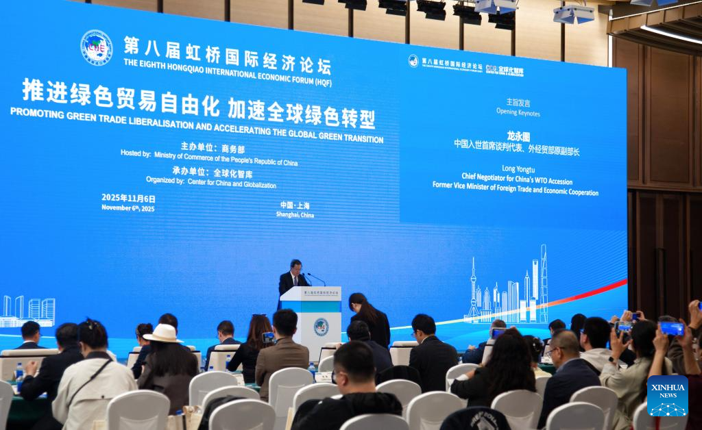 SHANGHAI, 6 noviembre, 2025 (Xinhua) -- Un subforo titulado "Promover la Liberalización del Comercio Verde y Acelerar de la Transición Verde Global" es celebrado durante VIII Foro Económico Internacional de Hongqiao en el Centro Nacional de Exposiciones y Convenciones (Shanghai), en Shanghai, en el este de China, el 6 de noviembre de 2025. (Xinhua/Tian Weiwei)