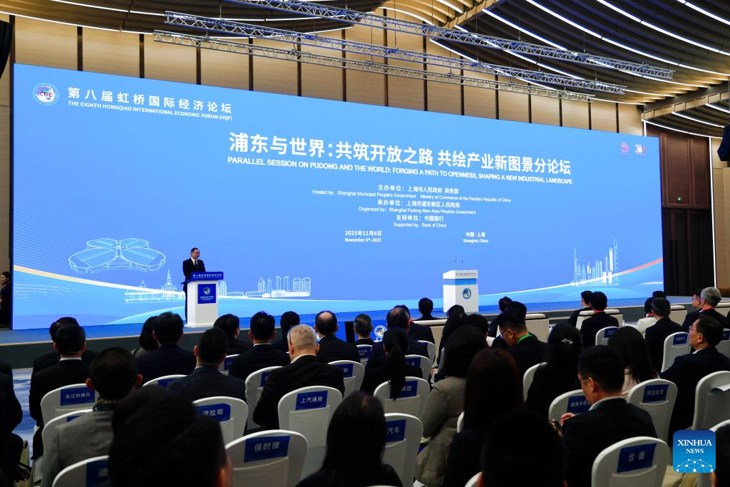 SHANGHAI, 6 noviembre, 2025 (Xinhua) -- Un subforo titulado "Pudong y el Mundo: Forjar un Camino hacia la Apertura, Configurar un Nuevo Panorama Industrial" es celebrado durante VIII Foro Económico Internacional de Hongqiao en el Centro Nacional de Exposiciones y Convenciones (Shanghai), en Shanghai, en el este de China, el 6 de noviembre de 2025. (Xinhua/Liu Jiaqi)